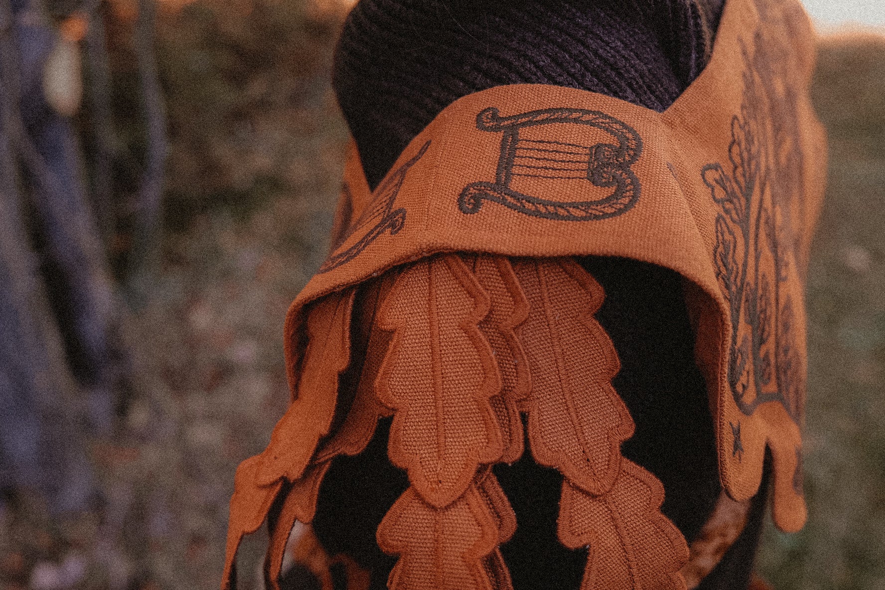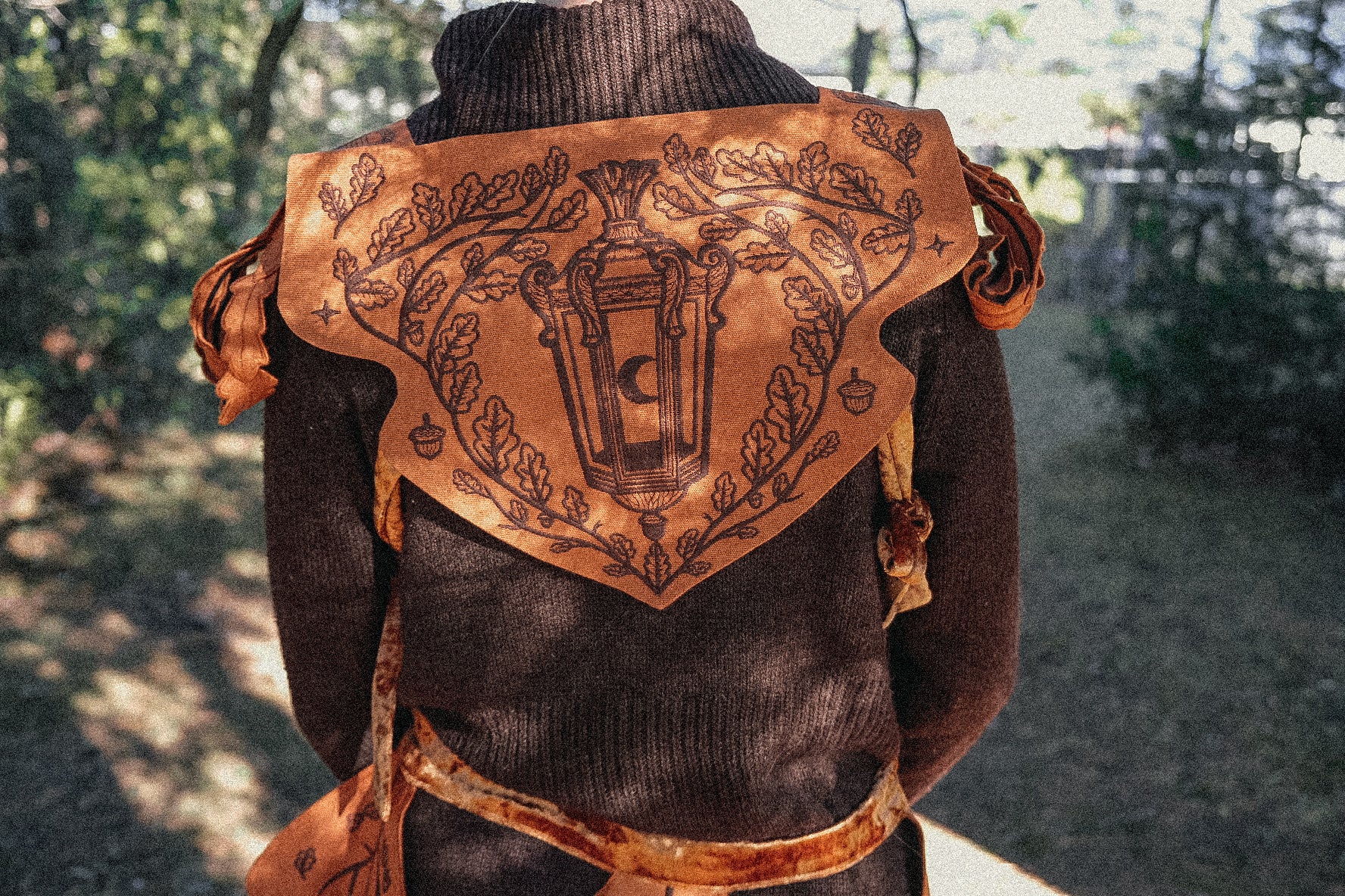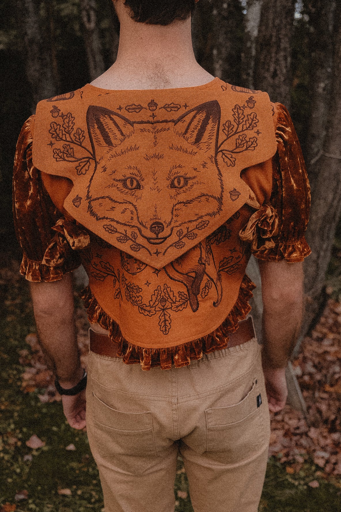 This lovely fox and lantern chest piece is made of sturdy orange canvas fabric and is embroidered with brown cotton threads. It features some oak leaves stripes that can be attached underneath the shoulders with snap buttons! They are fully removable ♡