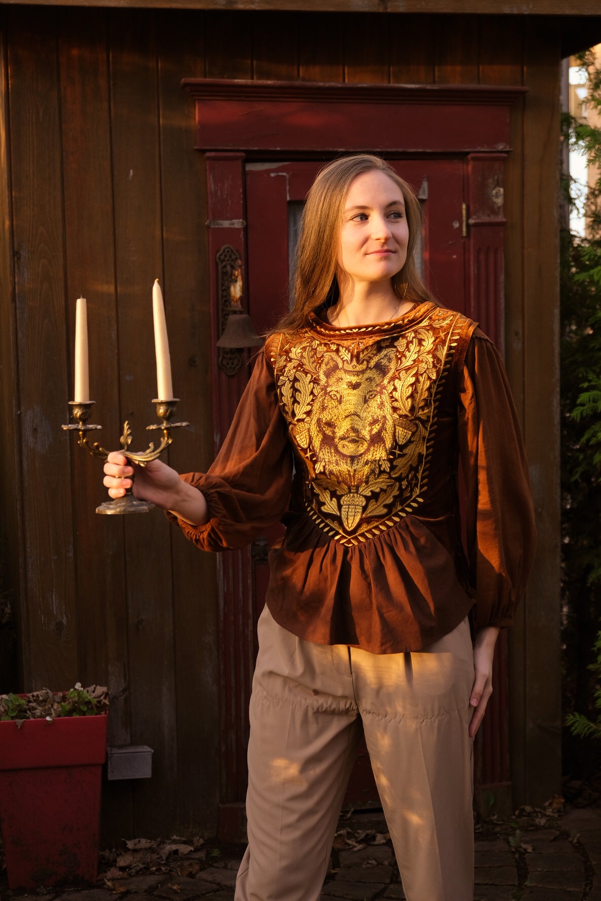 This intricate top is made of rich brown velvet as well as a linen & cotton blend for the bottom front part. This top is a lace up from the bottom to the arm hole so it is fully adjustable! (* on the pictures the lacing part doesn't go all the way to the arm hole because it was my first sample and the design has been improved since then )