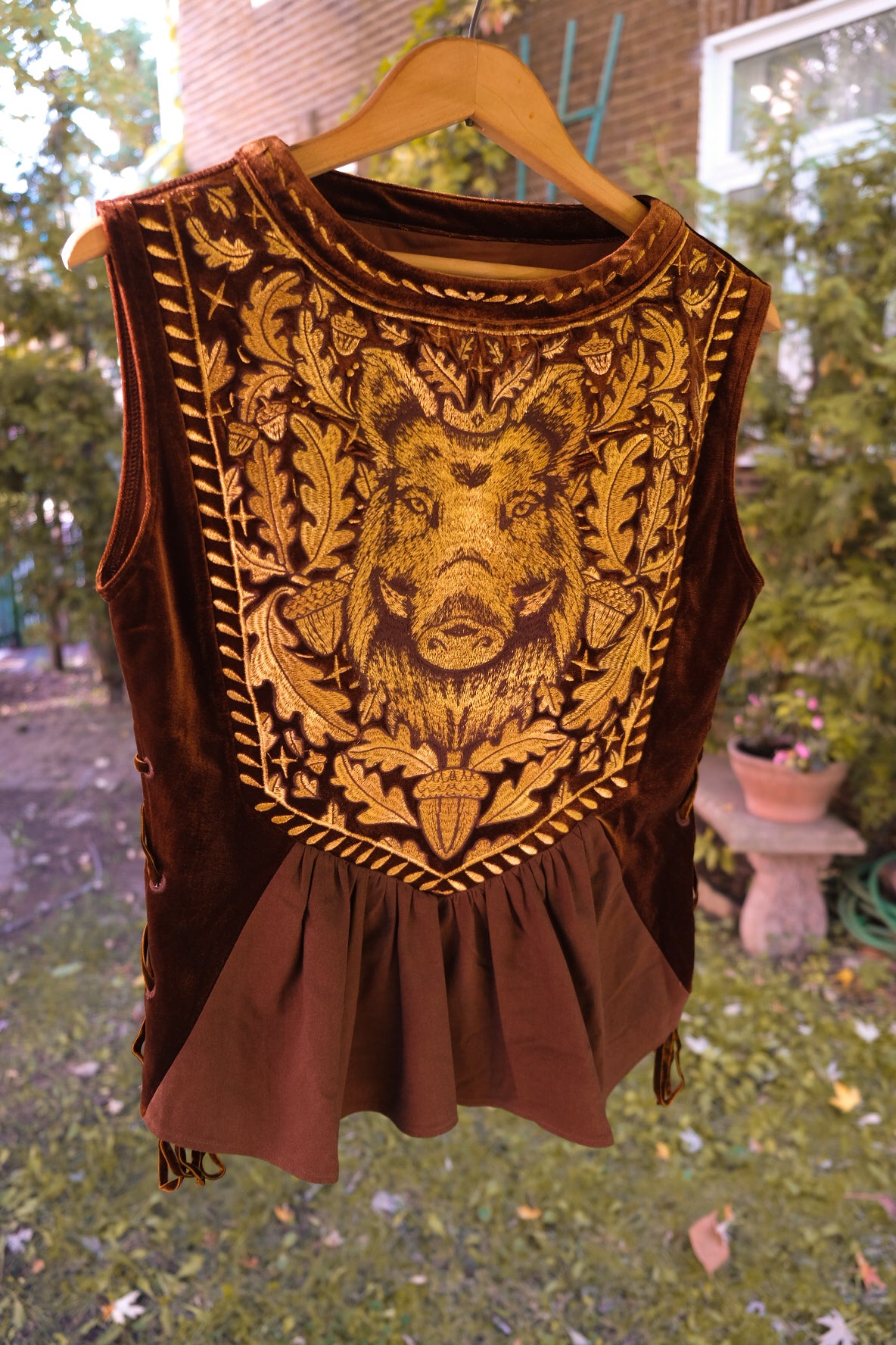 This intricate top is made of rich brown velvet as well as a linen & cotton blend for the bottom front part. This top is a lace up from the bottom to the arm hole so it is fully adjustable! (* on the pictures the lacing part doesn't go all the way to the arm hole because it was my first sample and the design has been improved since then )