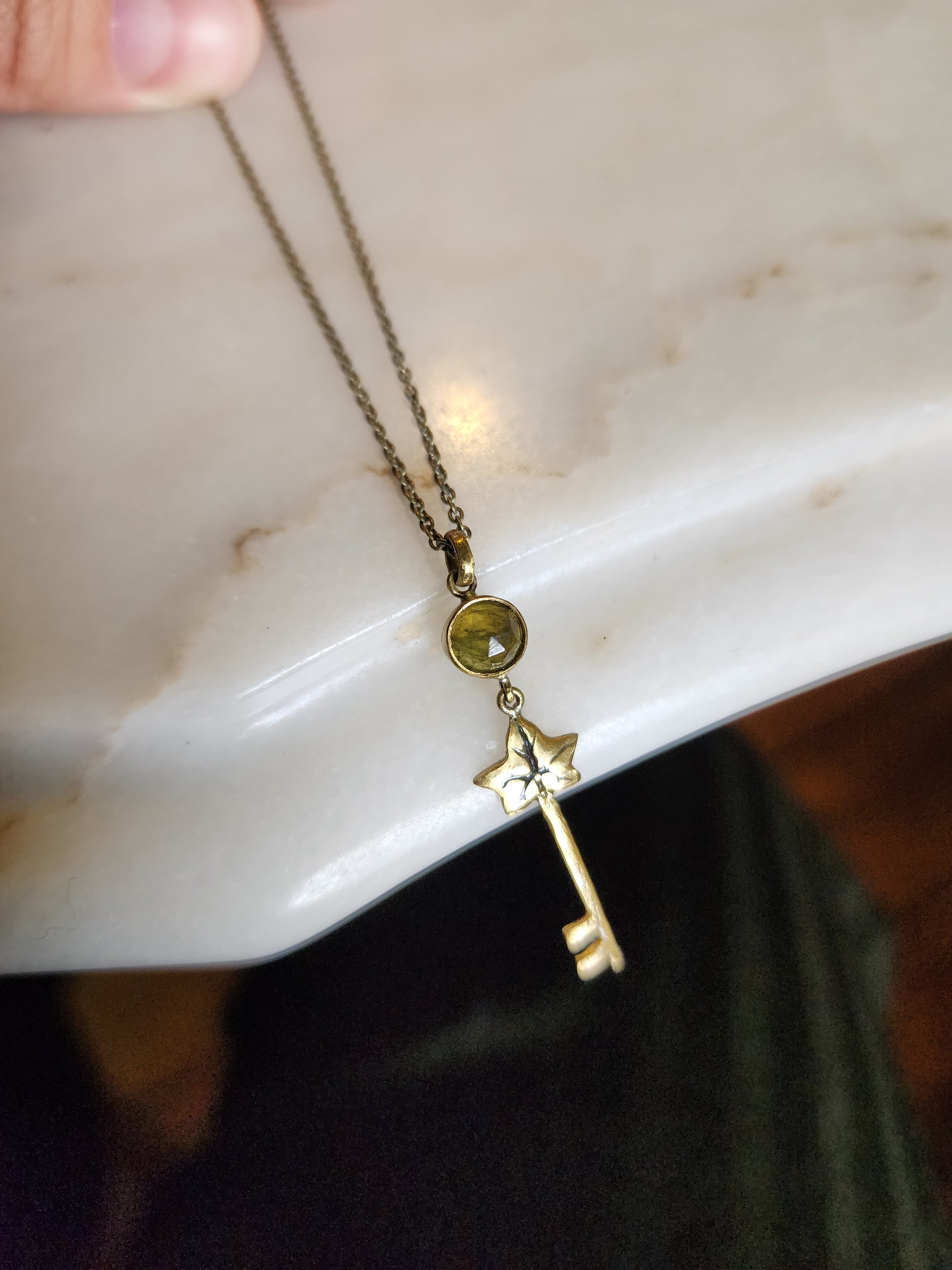 This lovely key necklace is the perfect dainty piece for nature lovers and Woodland hearts! It is adorned with a beautiful rosecut Vesuvianite stone! Layer it with other necklaces for a maximalist look!