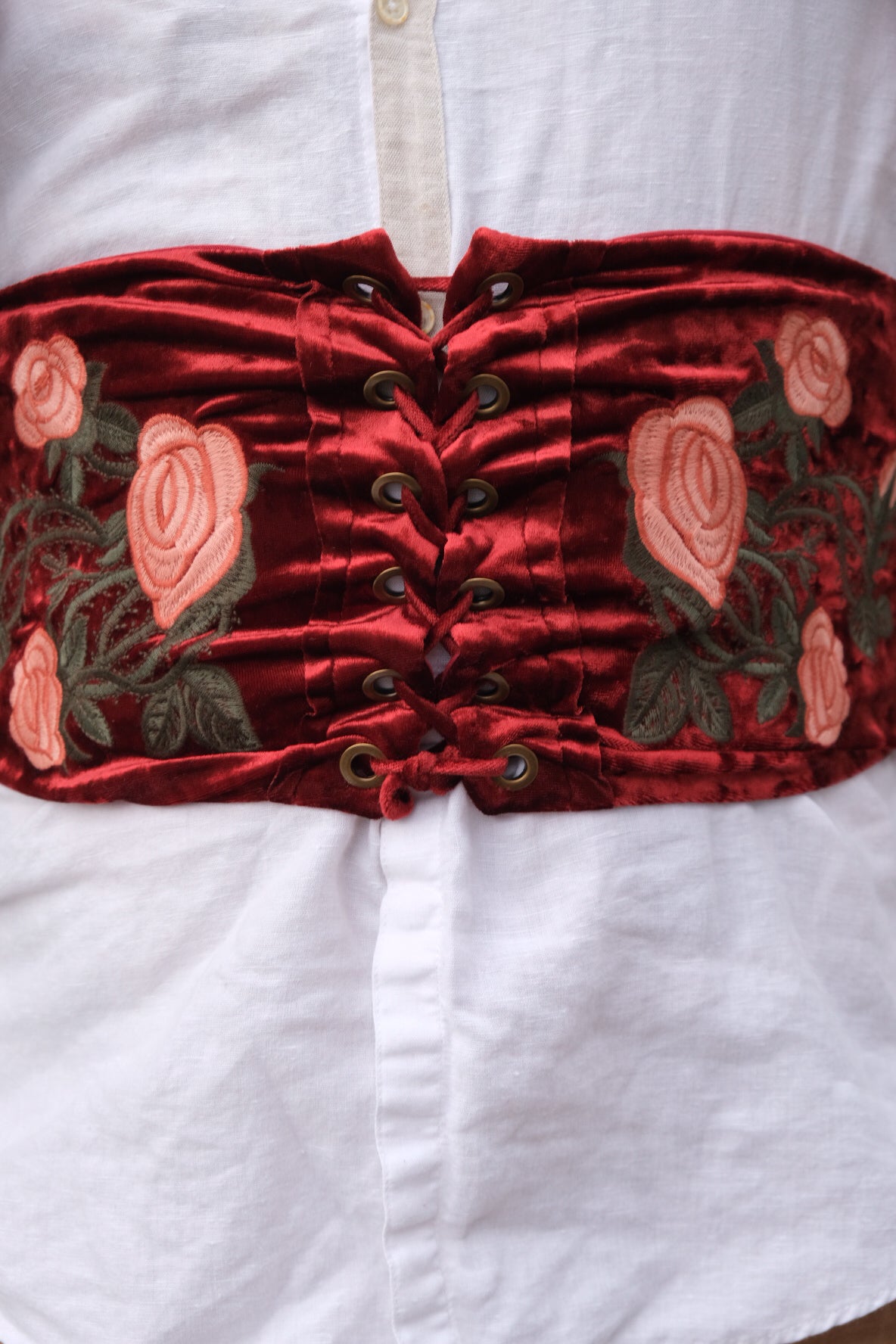 This shiny belt is made of sumptuous velvet fabric and features thorns + roses embroideries! ( and swords of course)