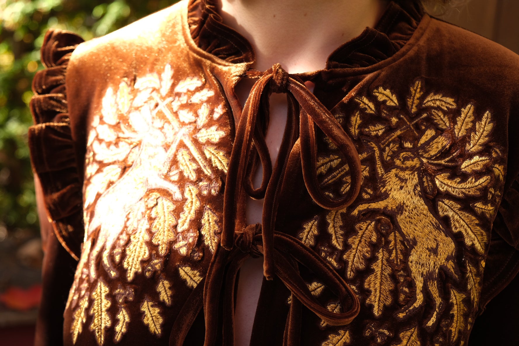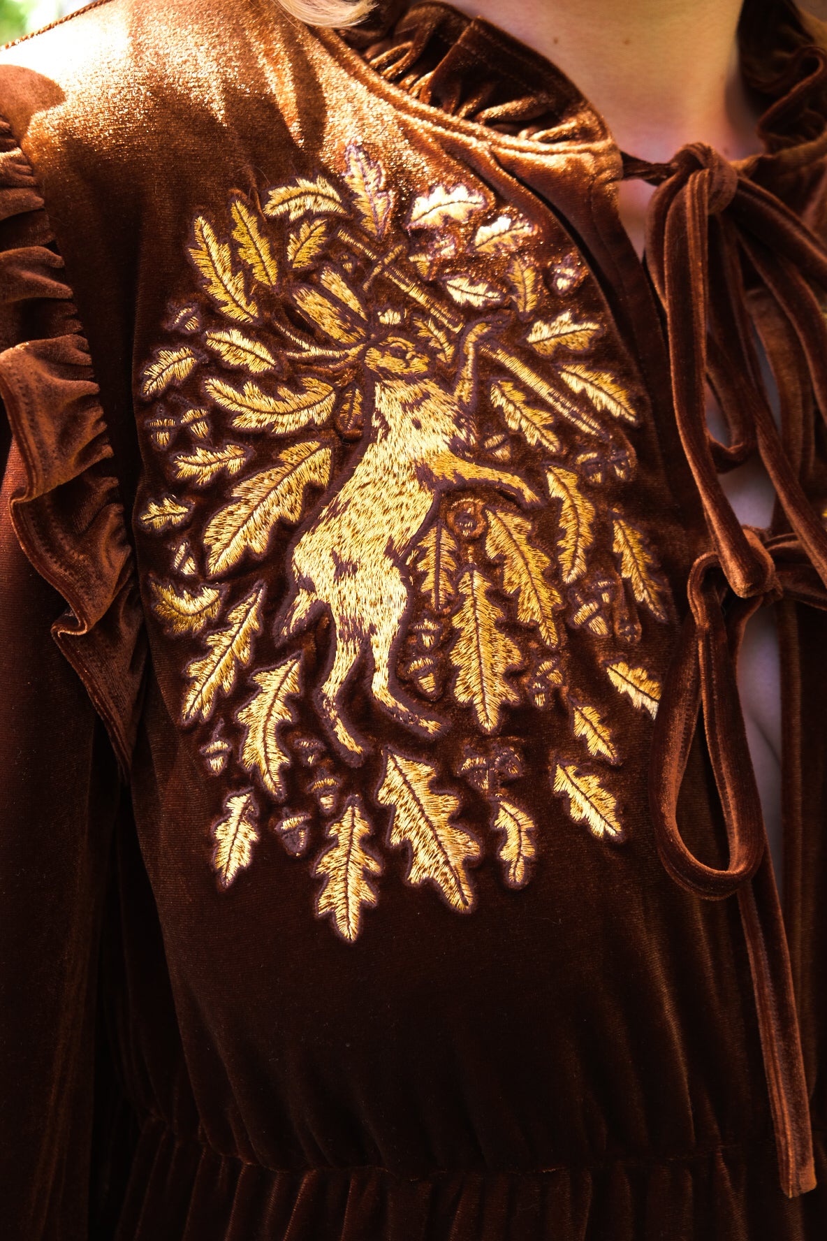This fantasy dress is made of rich brown velvet! It features metallic gold embroideries on every side!