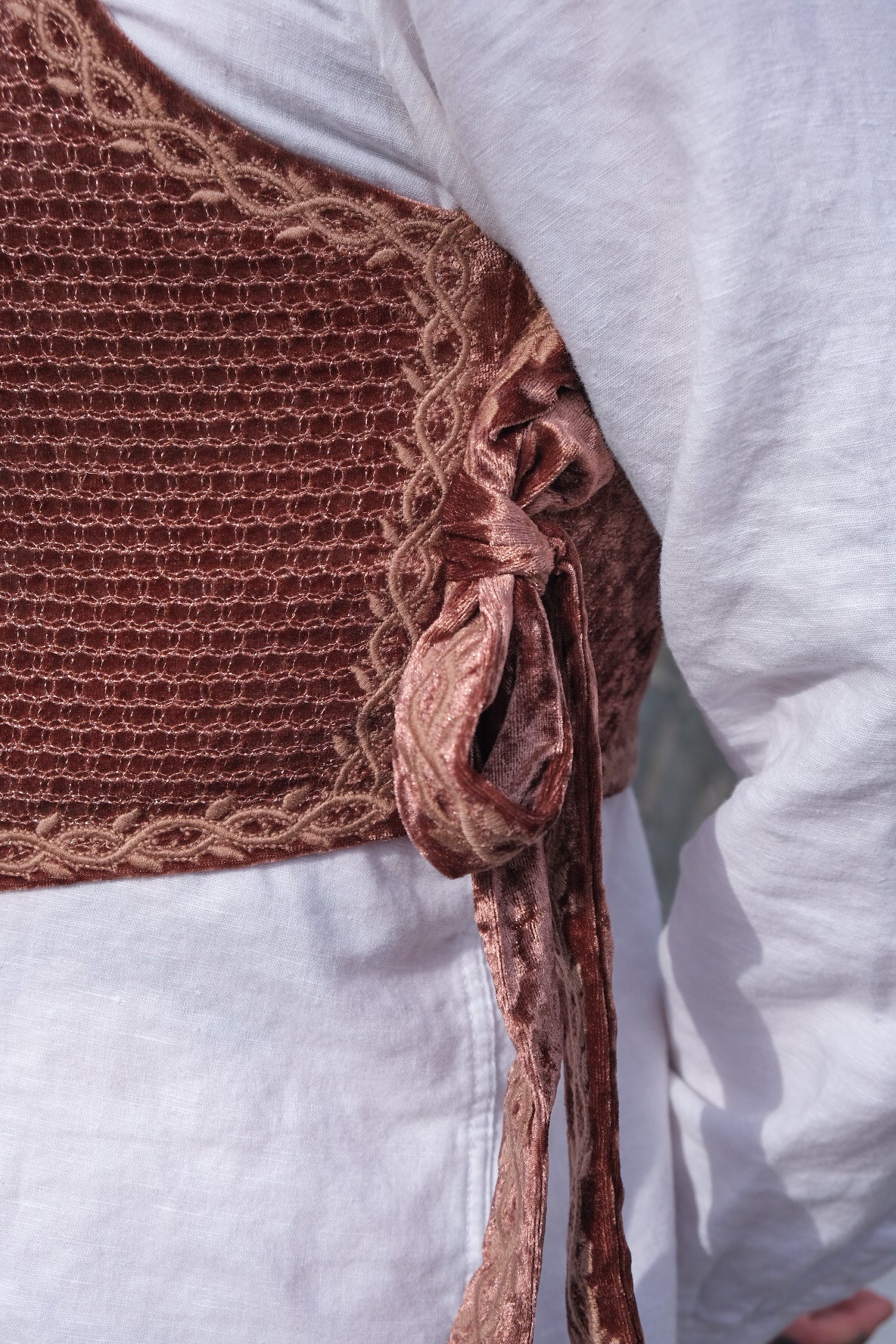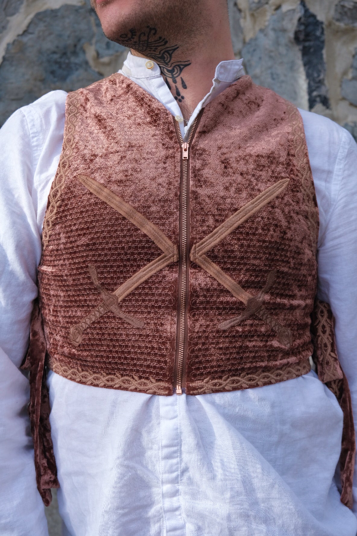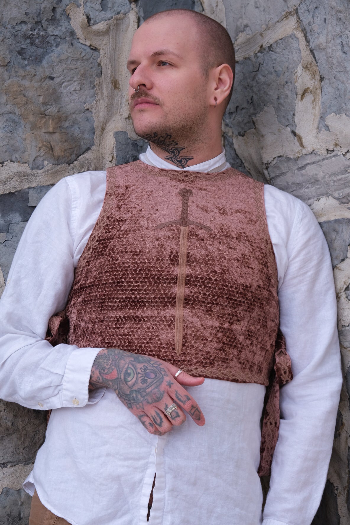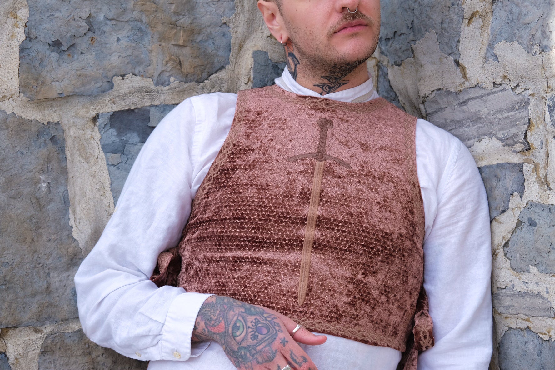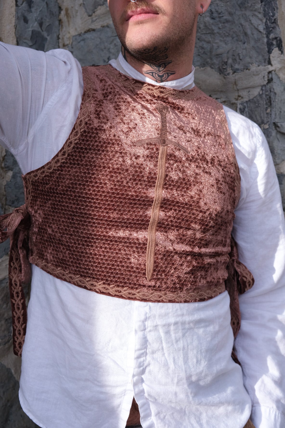 This shiny chestplate top is made of sumptuous velvet fabric and features chainmail & swords embroidery ⚔️