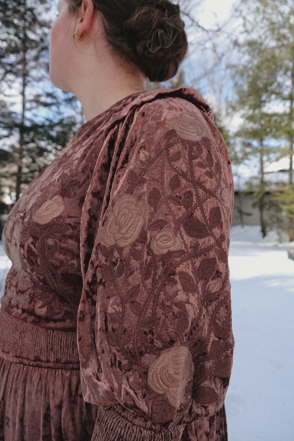 This lovely dress is made of sumptuous velvet fabric and features thorns + roses embroideries! ( and swords ofc!)