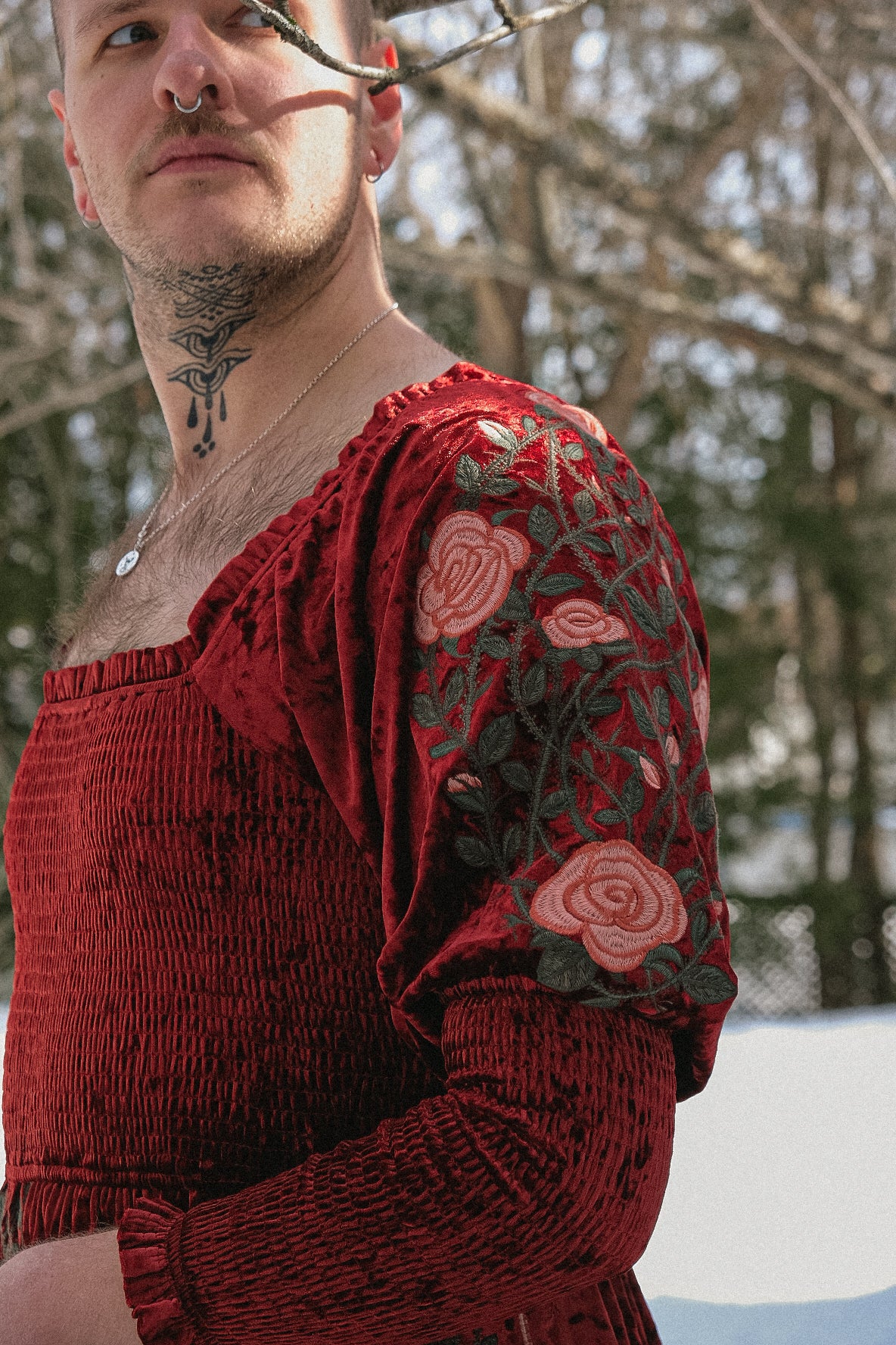 This lovely dress is made of sumptuous velvet fabric and features thorns + roses embroideries! ( and swords ofc!)