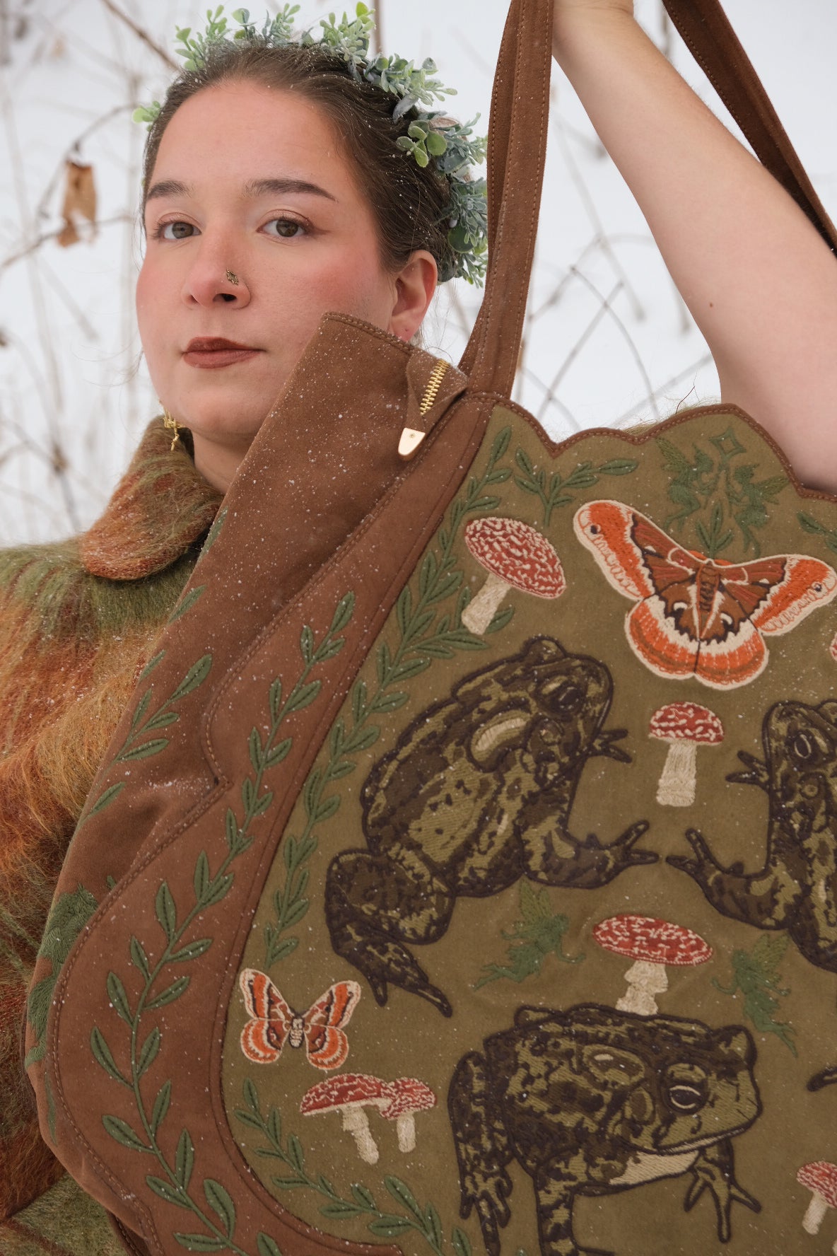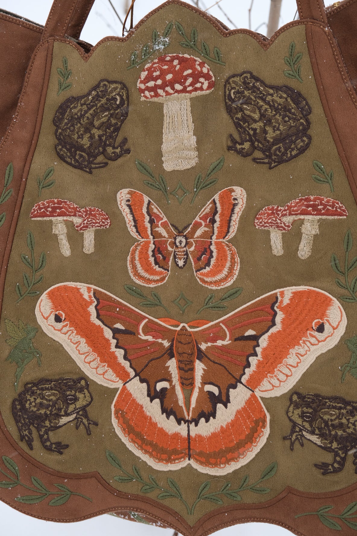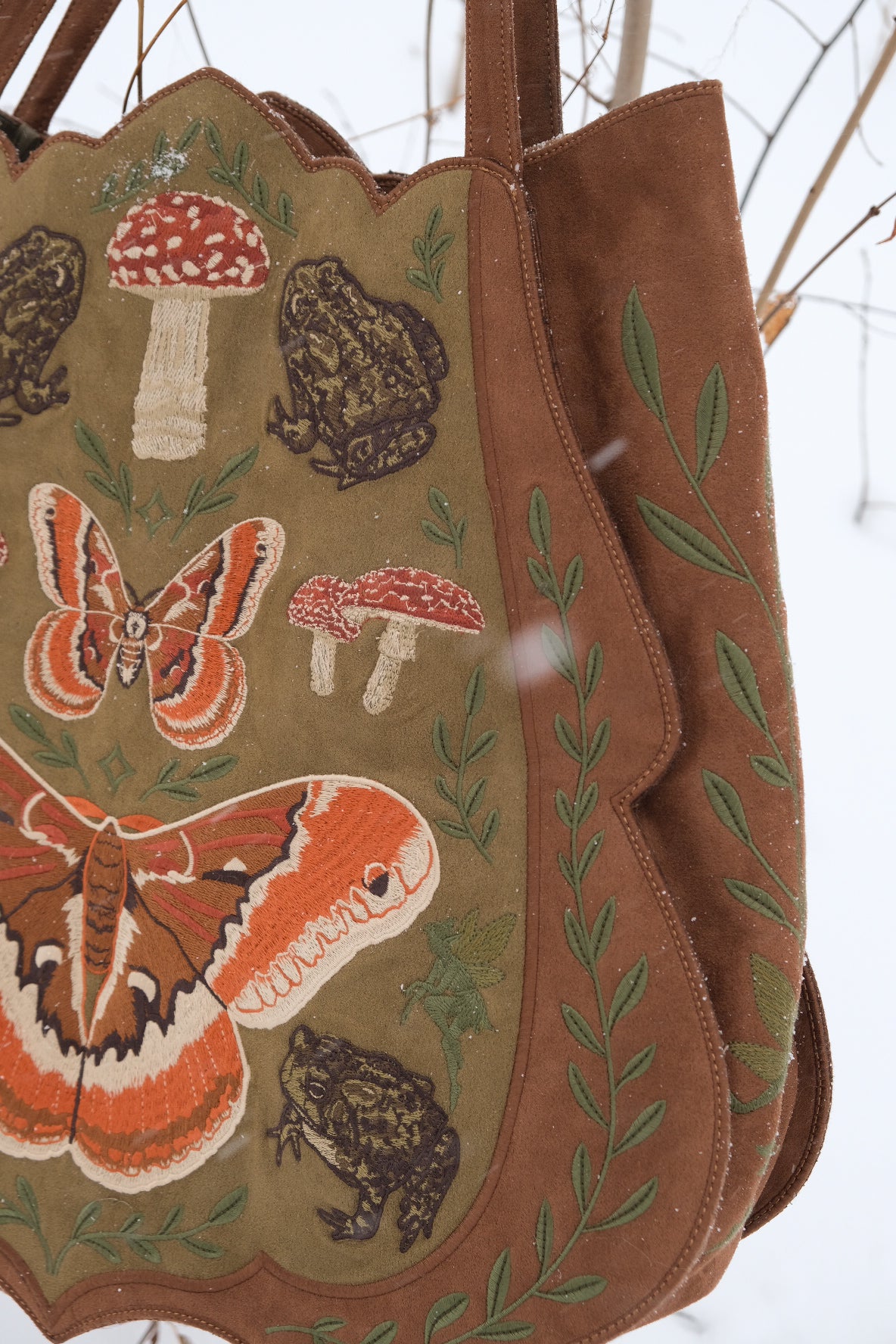 The Fairy Realm Bag is an oversized, story-laden companion crafted to carry the magic of Mosswood beyond the forest paths. Made from supple faux suede, this XL bag is adorned with the same intricate, tapestry-like embroidery found on the Fairy Queen Dress — a dense interplay of moths, toads, vines, fairies, and forest mushrooms, woven together in rich, earthy tones.