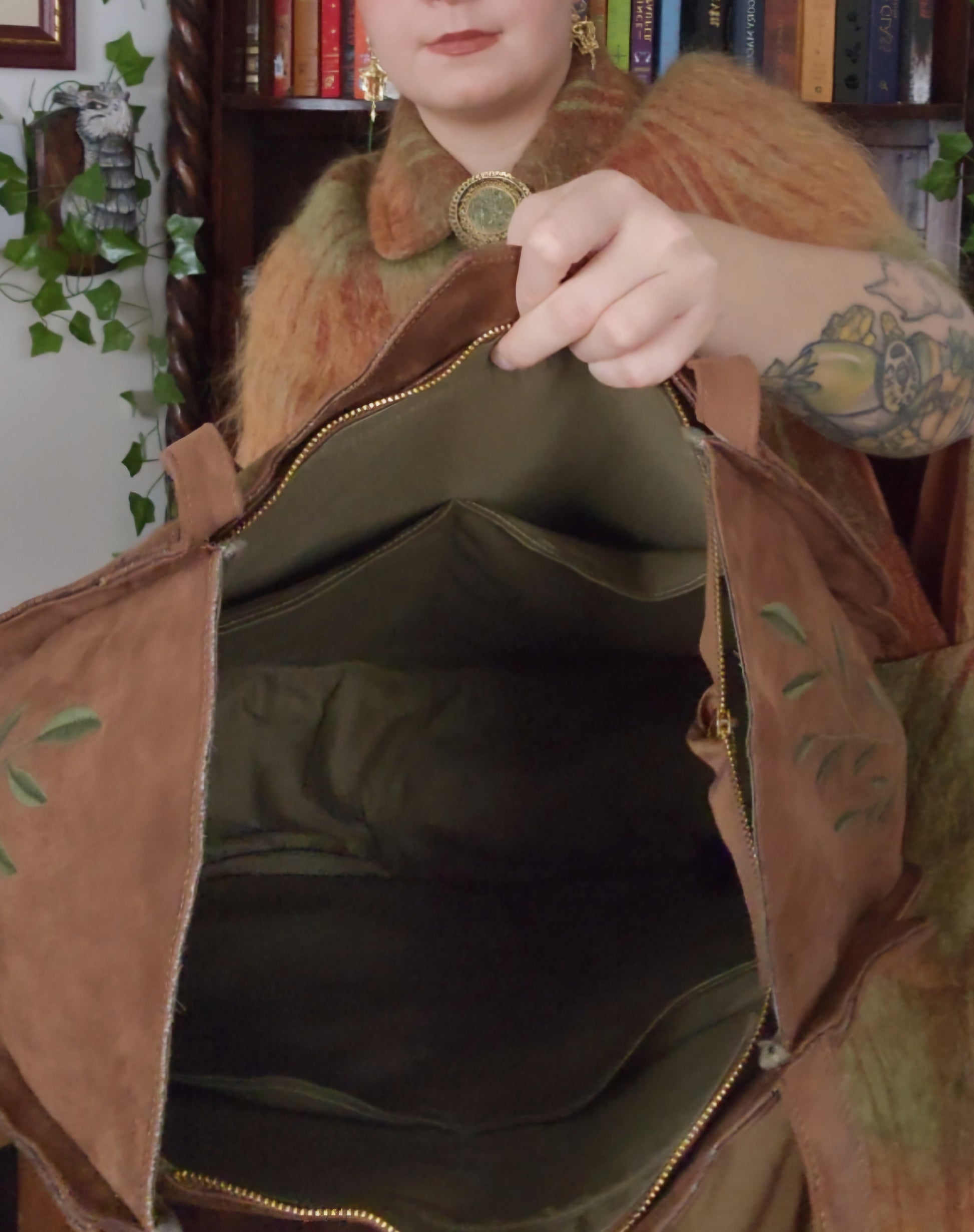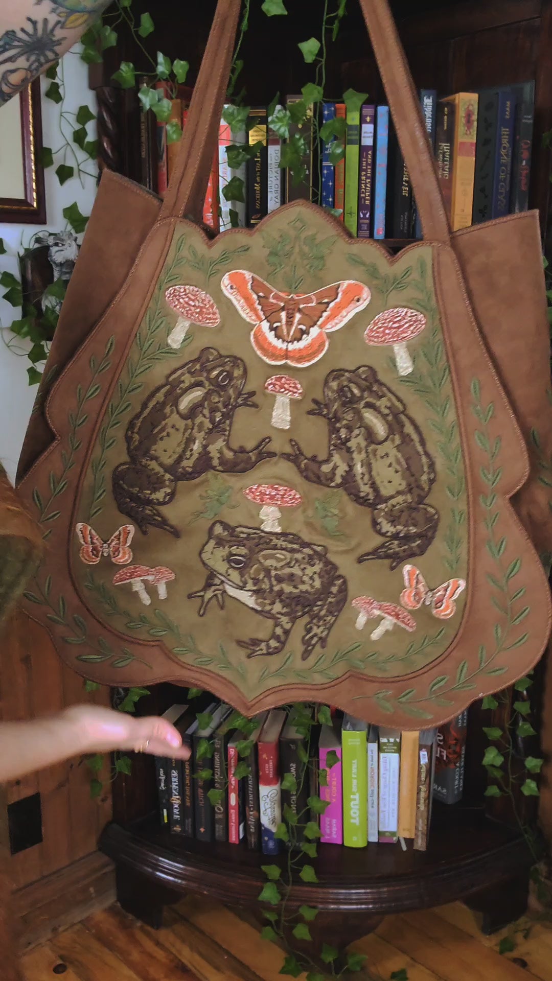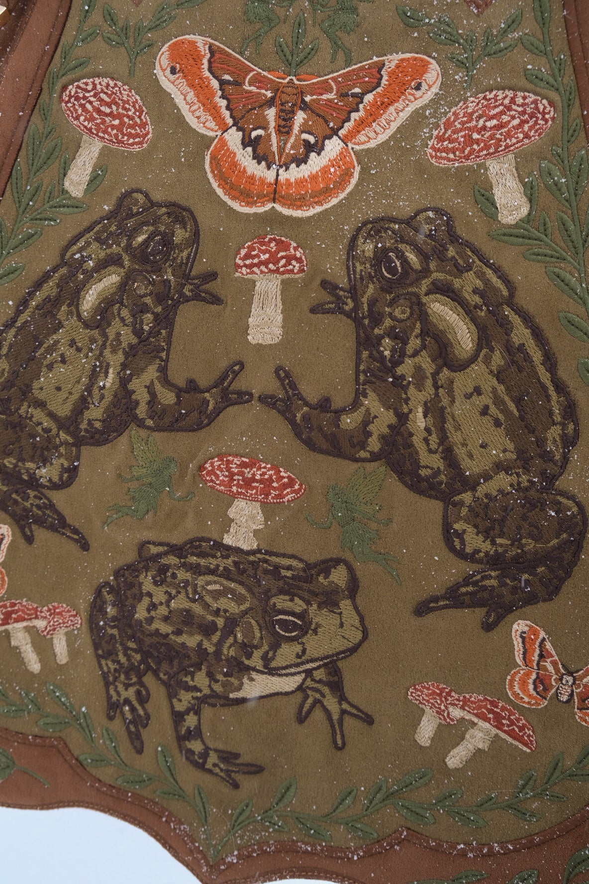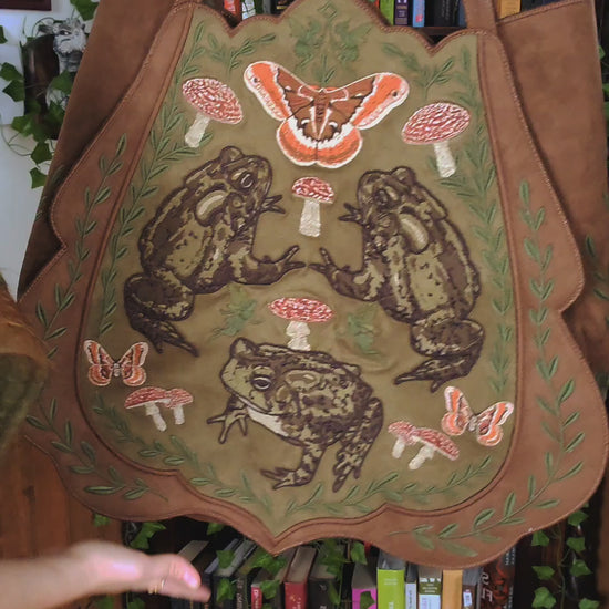 The Fairy Realm Bag is an oversized, story-laden companion crafted to carry the magic of Mosswood beyond the forest paths. Made from supple faux suede, this XL bag is adorned with the same intricate, tapestry-like embroidery found on the Fairy Queen Dress — a dense interplay of moths, toads, vines, fairies, and forest mushrooms, woven together in rich, earthy tones.