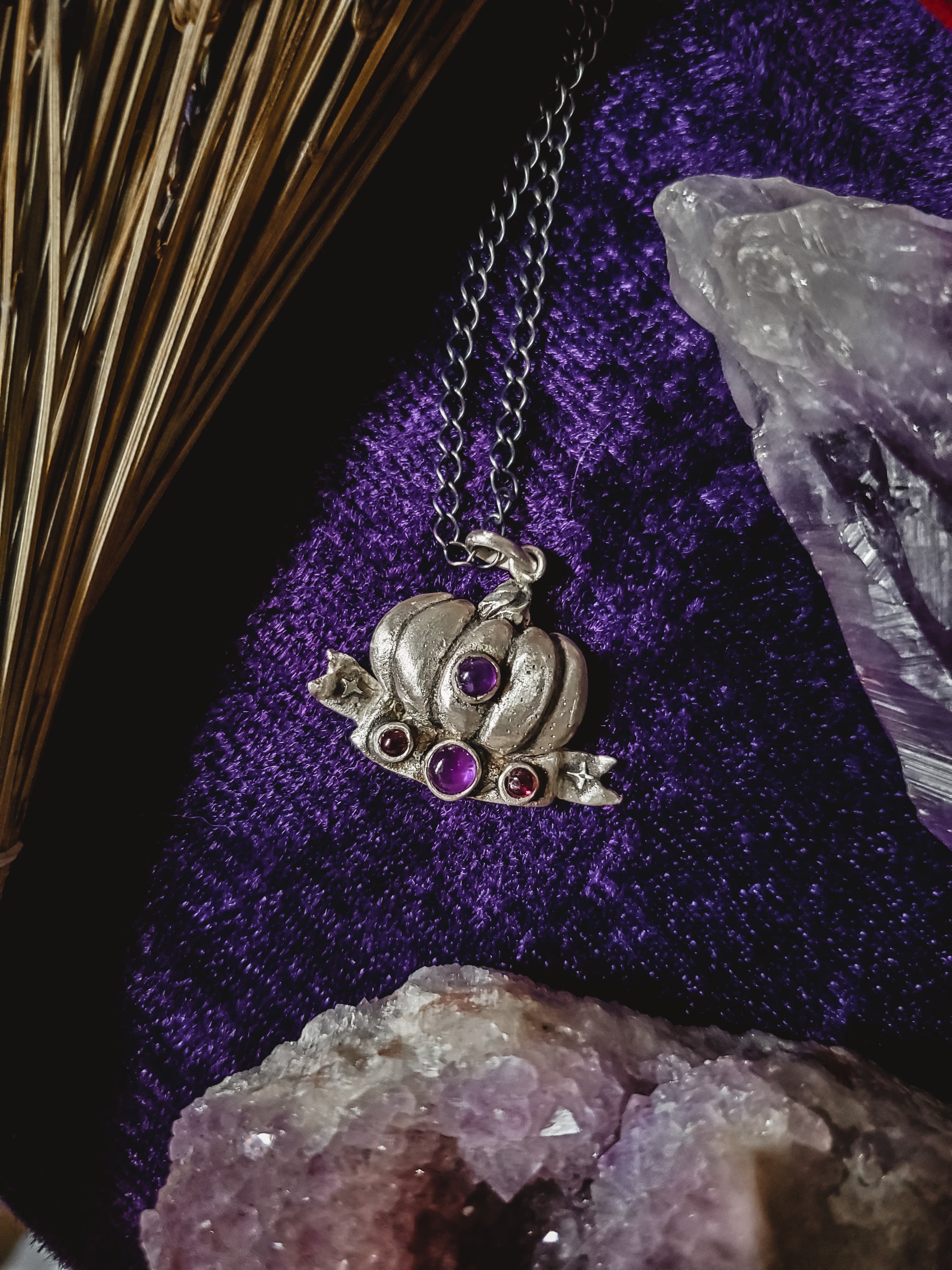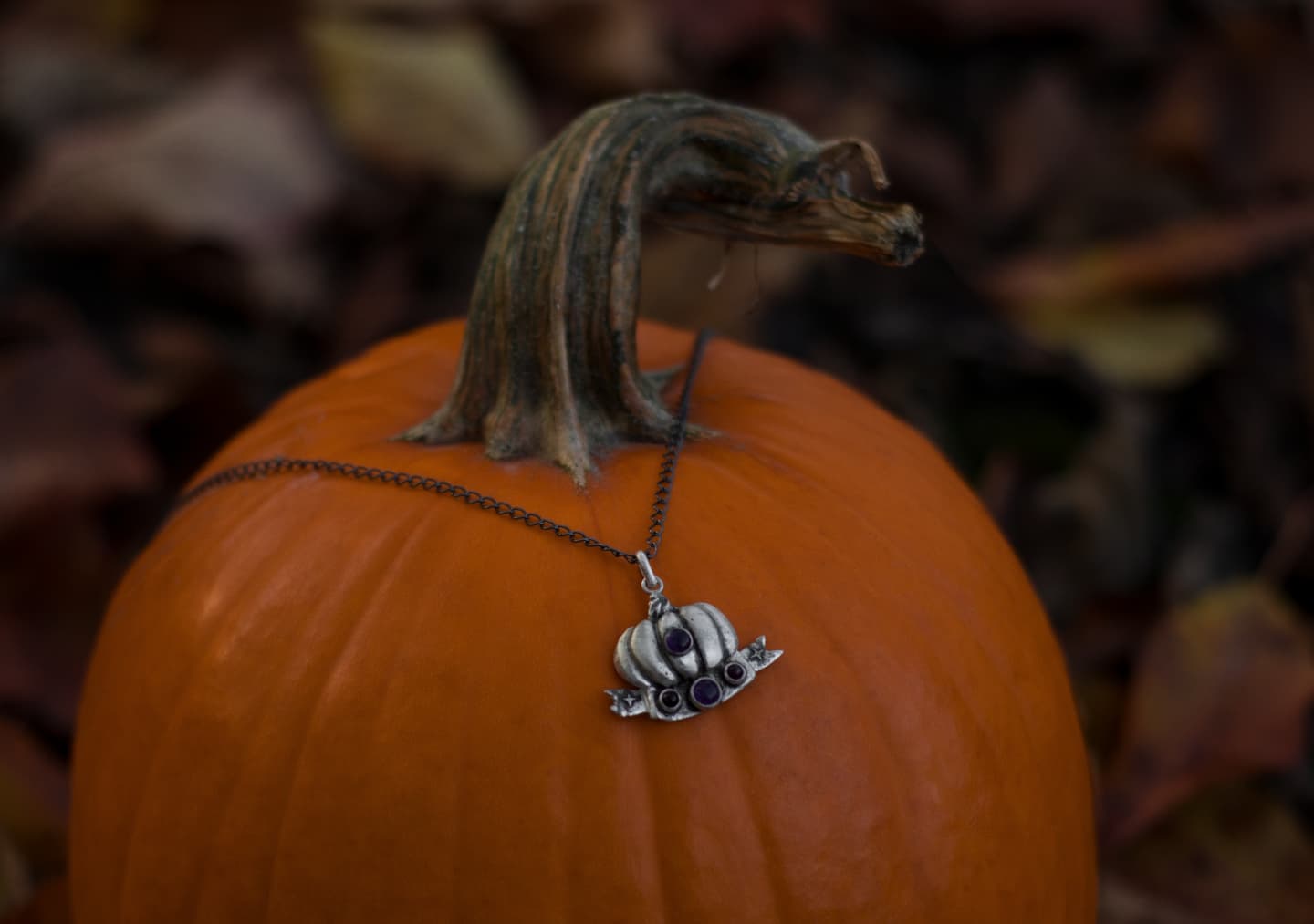 ✧This sterling silver design features a lovely pumpkin and a small banner underneath. It has an antique finish and is adorned with two amethyst stones & two small garnet stones on each side.